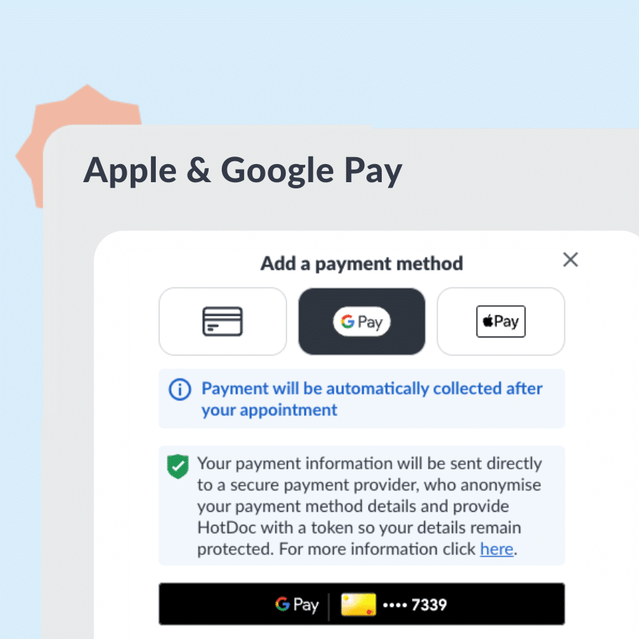 Patients can now pay for appointments using Apple Pay or Google Pay across key HotDoc payment flows. Checkout is faster, more secure, and patients no longer need to manually enter card details, reducing drop-off at the payment step.