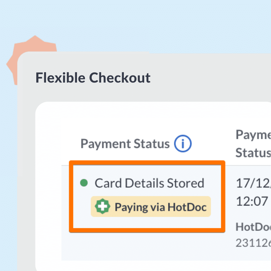 Flexible Checkout Previously known as Patient Payment Preferences, Flexible Checkout allows patients to pre-select a payment method — including digital wallets or a saved card — for upcoming face-to-face appointments that don’t have other payment methods enabled. This is an optional feature that can be switched on/off.