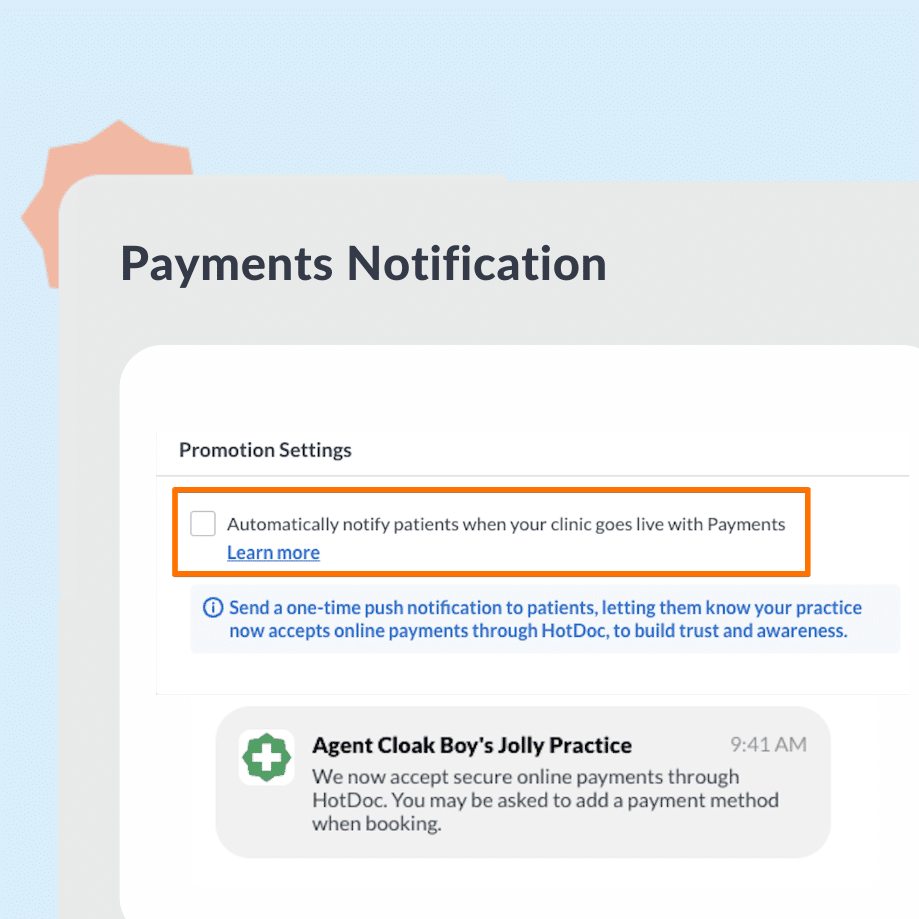 When your practice first goes live with HotDoc Payments, HotDoc automatically sends a one-off push notification to eligible patients to let them know online payments are available. Drive awareness and early adoption right from day one.